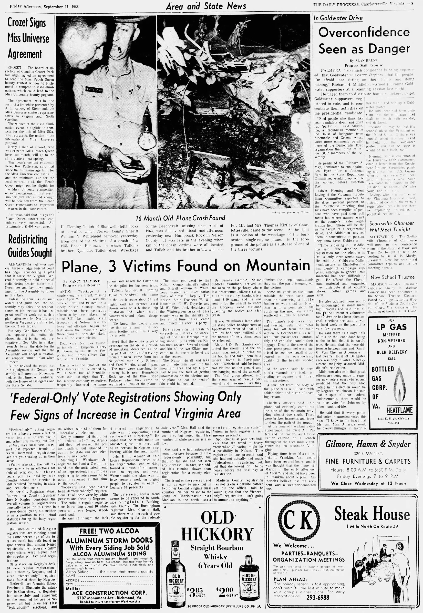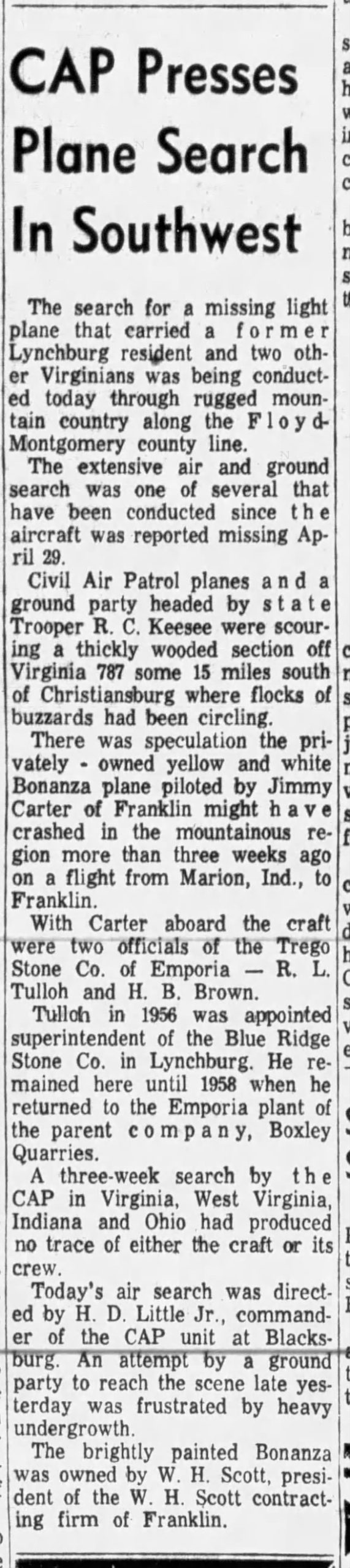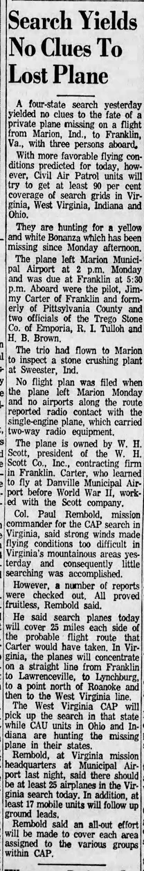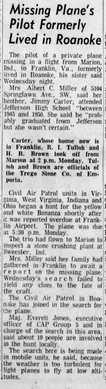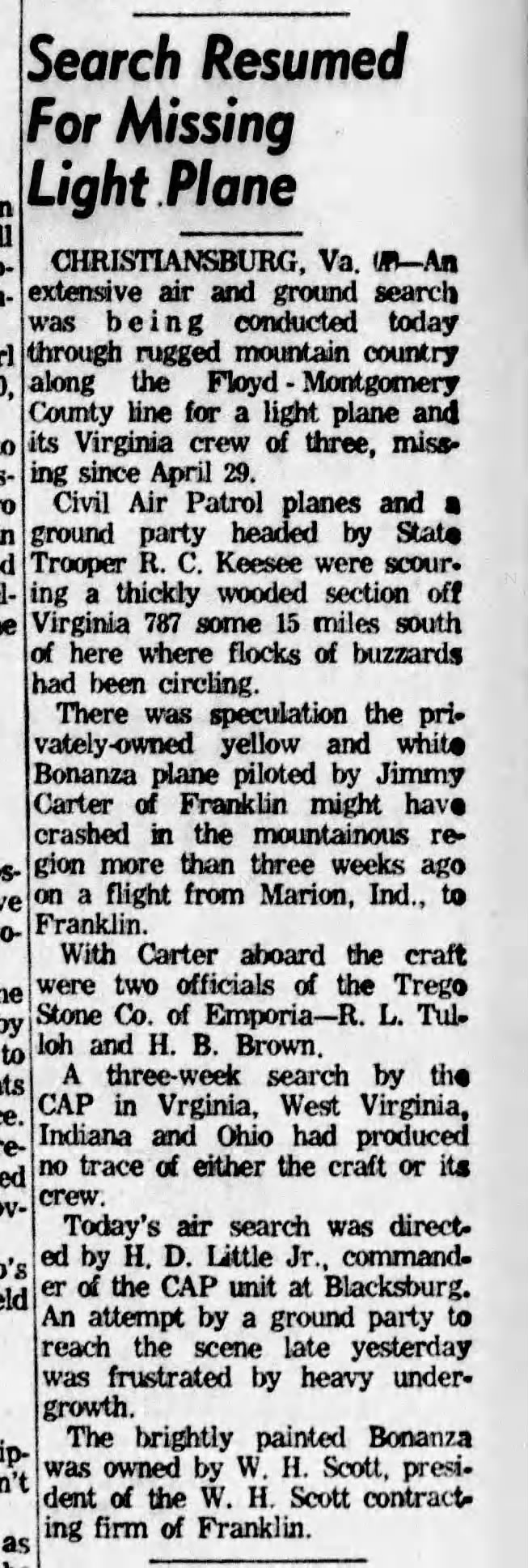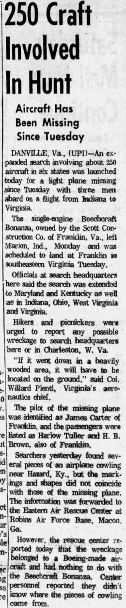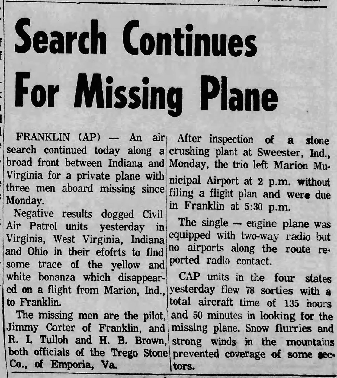 On April 29, 1963, a civilian 1955 Beechcraft Bonanza collided into the mountainside during a return flight from Marion, Indiana, resulting in the deaths of all three occupants: James Oliver Carter (the pilot), Ryan Lee Tulloh, and Harry Brown (both were officials of the Trego Stone Co. out of Emporia, Va). They left Indiana around 2 p.m. after inspecting a stone crushing plant without filing a flight plan. Search and rescue crews were dispatched after the aircraft failed to arrive at its intended destination of Franklin, Virginia, around 5:30 p.m.